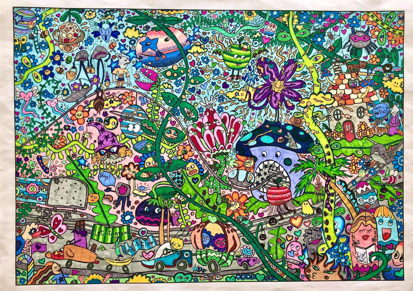Everything is connected and nature is magical is the theme of this poster. All of our colouring posters have the Boopino bubble monorail going throughout the image, with a carriage left empty for you to draw your own passengers and a place to sign your names.